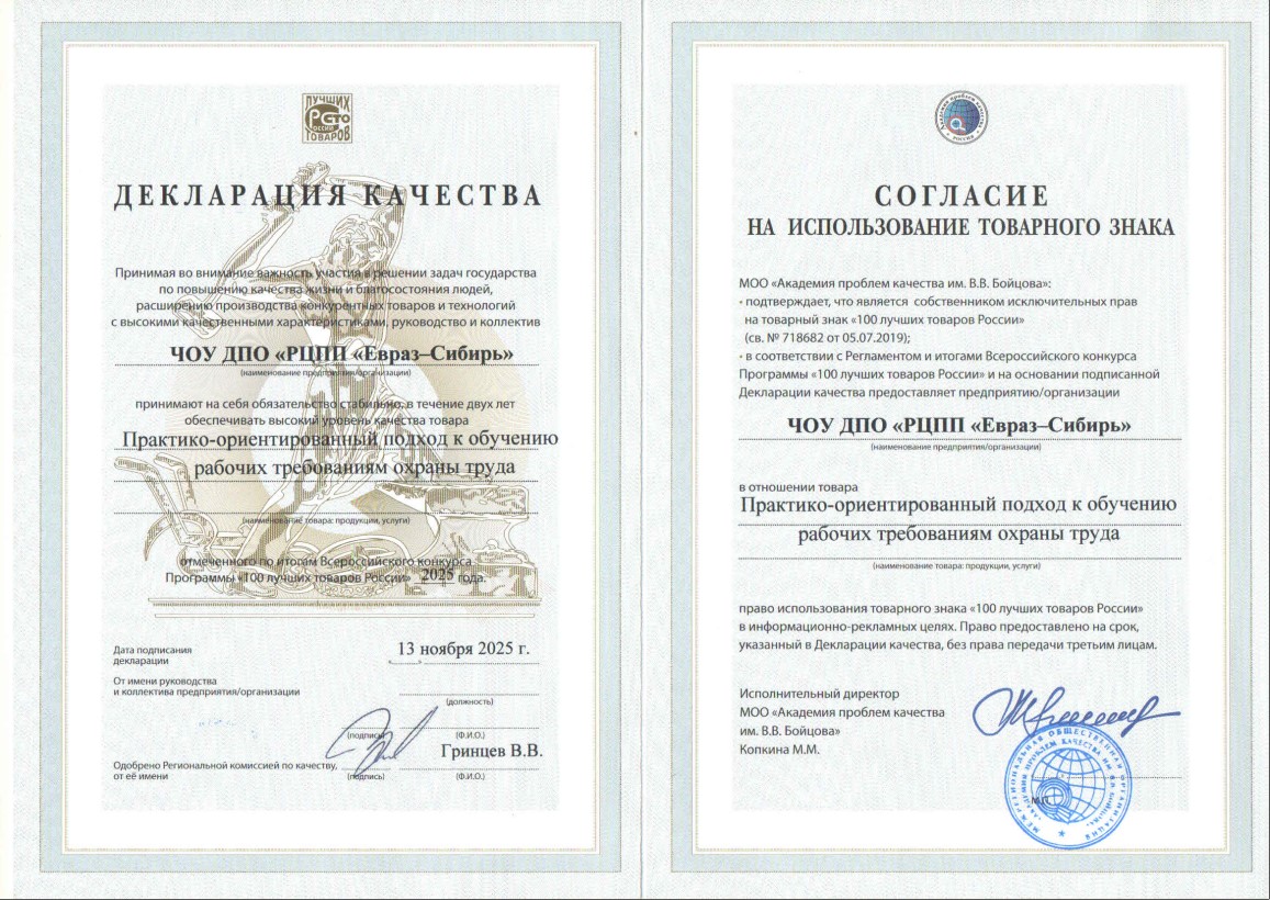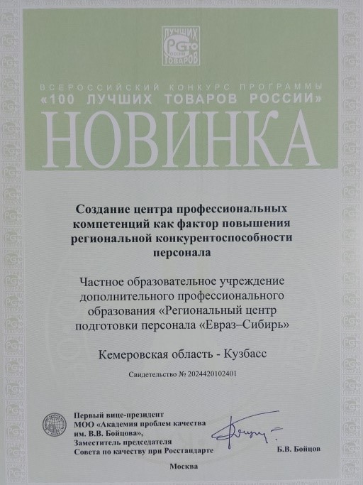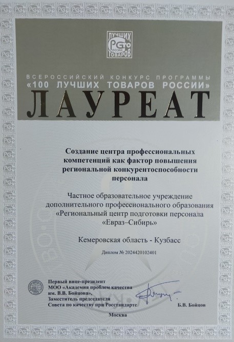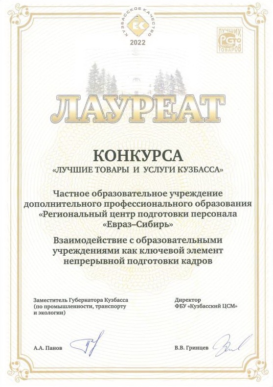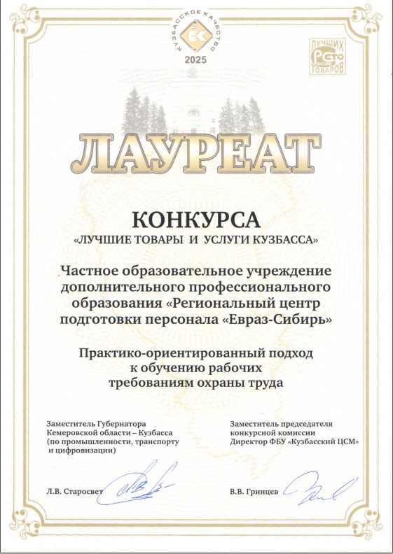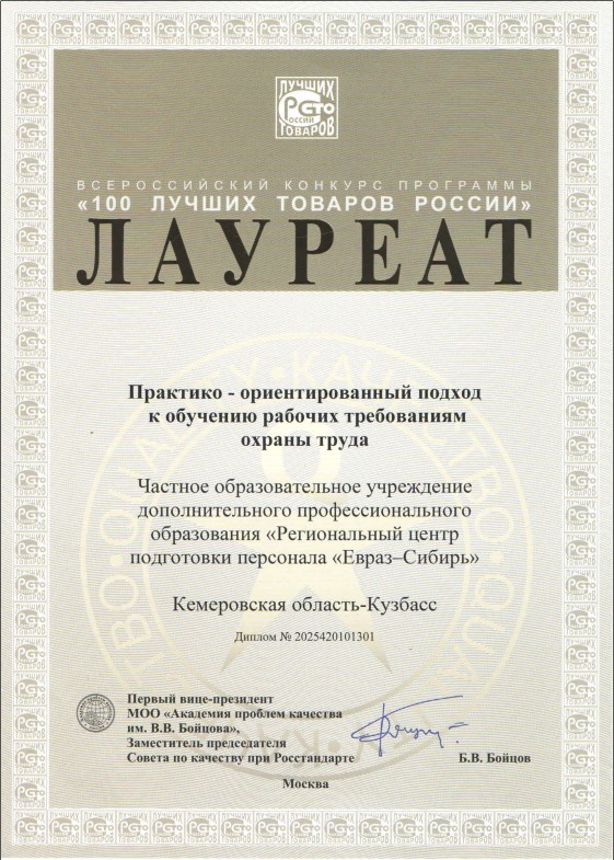 Лауреат» конкурса «Лучшие товары и услуги Кузбасса» и «Лауреат» конкурса «100 лучших товаров России» по направлению ««Отработка практических навыков при выполнении работ на высоте»