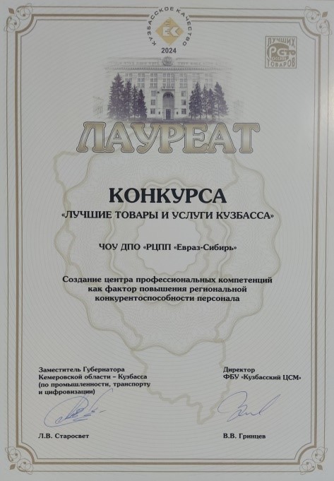 Лауреат» конкурса «Лучшие товары и услуги Кузбасса» и «Дипломант» конкурса «100 лучших товаров России» по направлению «Кейс-метод как инструмент высокой степени вовлеченности участников обучения в обсуждение материала и обмен имеющимся практическим опытом по теме обучения»