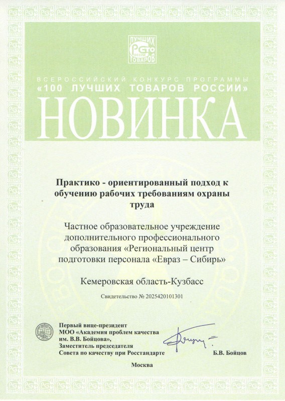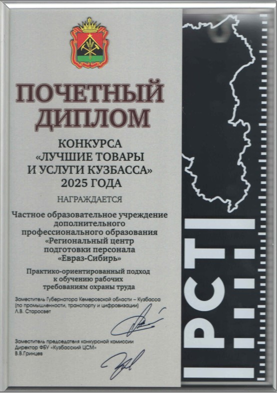 Лауреат» конкурса «Лучшие товары и услуги Кузбасса» и «Лауреат» конкурса «100 лучших товаров России» по направлению ««Отработка практических навыков при выполнении работ на высоте»